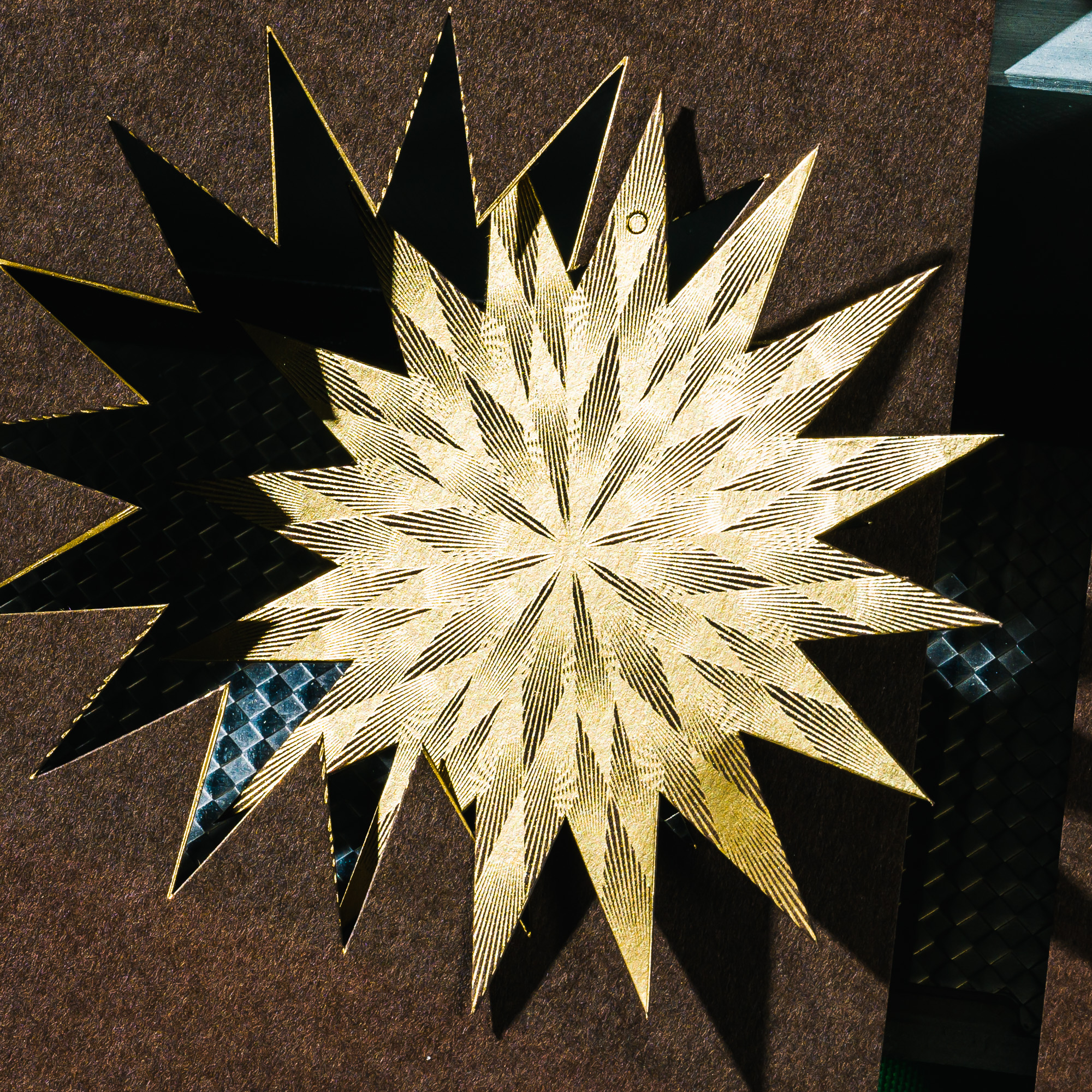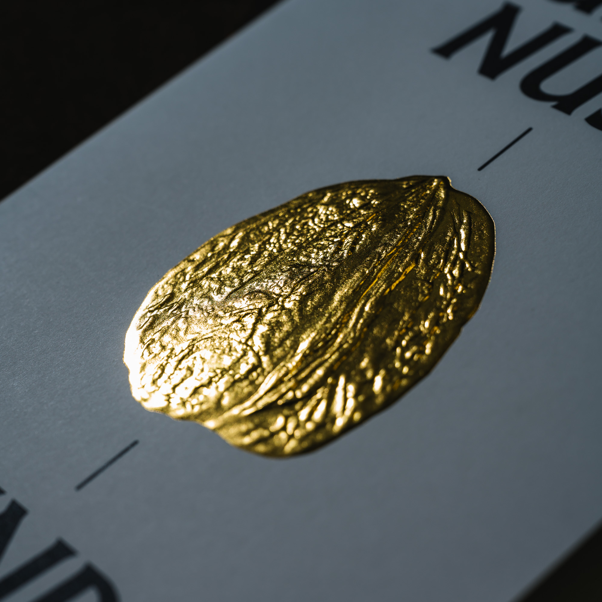 Der 600 Gramm starke Buchbinder-Graukarton hat eine Farbe und Oberflächenstruktur, die an Sand erinnert. Das feine Signet der Wim Wenders Stiftung wird durch Offsetdruck und nachträgliche Blindprägung auf dem Heidelberger Tiegel extrem präzise eingedruckt. Dem Pantone Schwarz werden 20% Silber beigemischt, was den geheimnisvollen Glanz der Karte verstärkt. Das wahre Leuchten kommt jedoch von dem Farbschnitt in Neonorange.